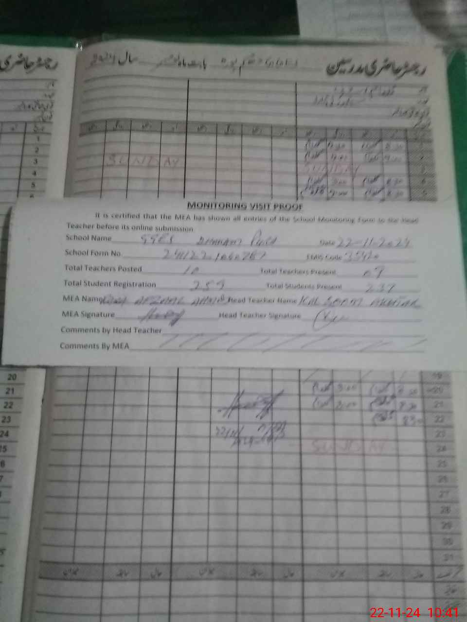 | Attendance Register | Head Teacher | MEA with School | Visit Proof |