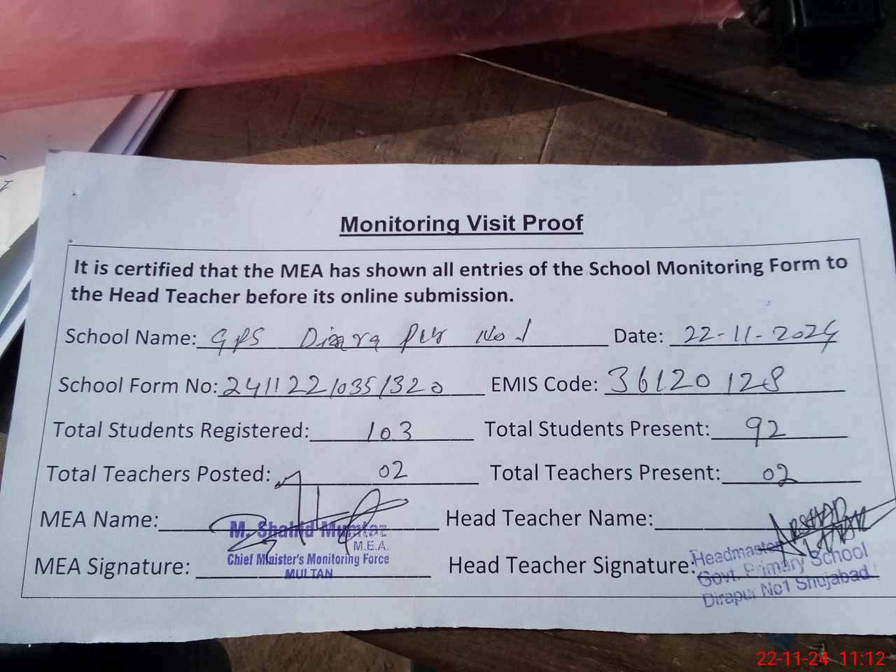 | Attendance Register | Head Teacher | MEA with School | Visit Proof |