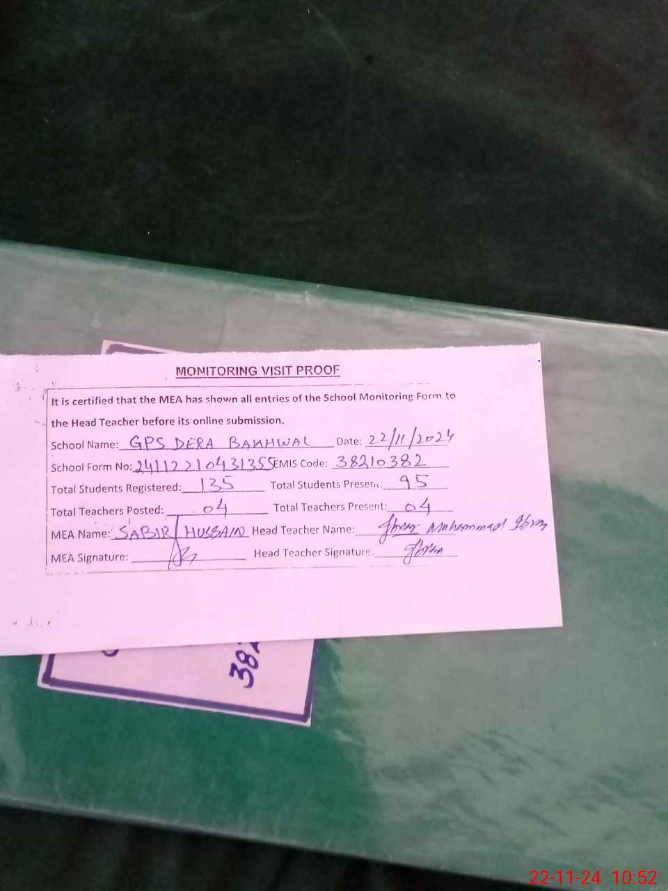 | Attendance Register | Head Teacher | MEA with School | Visit Proof |