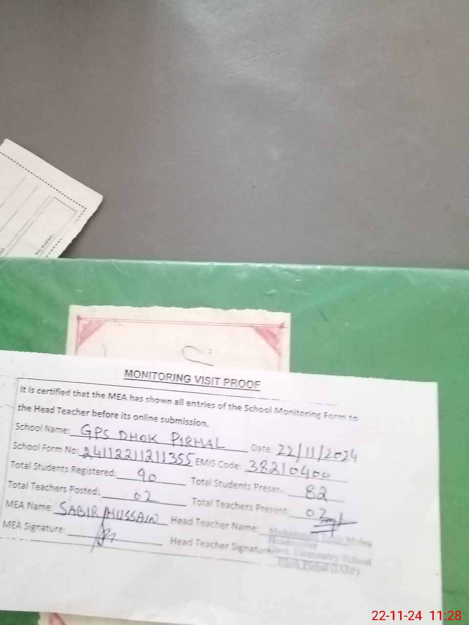 | Attendance Register | Head Teacher | MEA with School | Visit Proof |