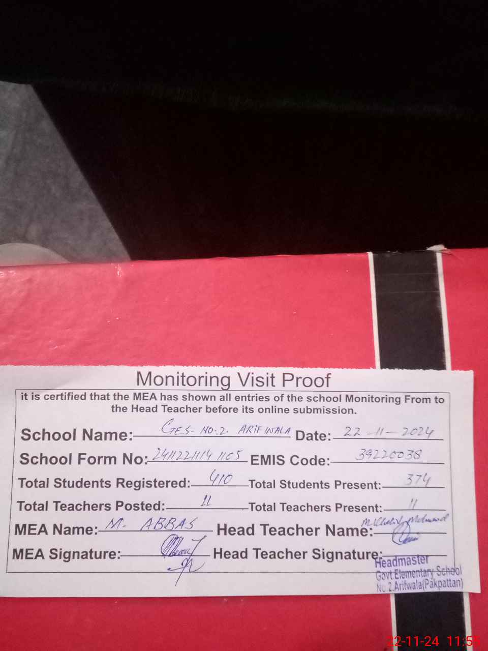 | EMIS Code: 39220038 | Name of School: GES MODEL NO. 2 D BLOCK ARIF WALA | |||