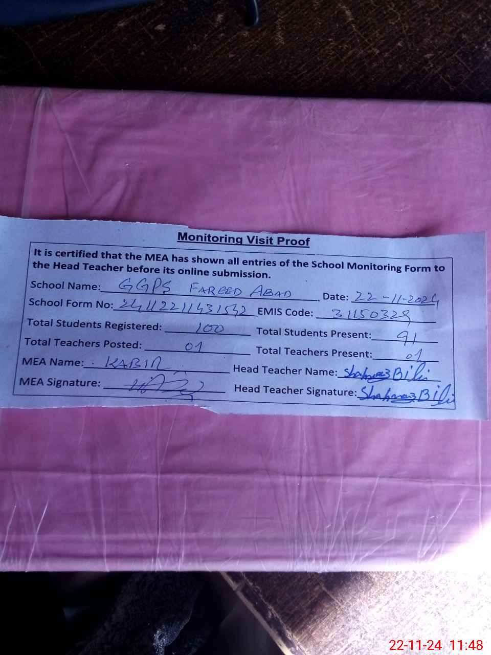 | Attendance Register | Head Teacher | MEA with School | Visit Proof |