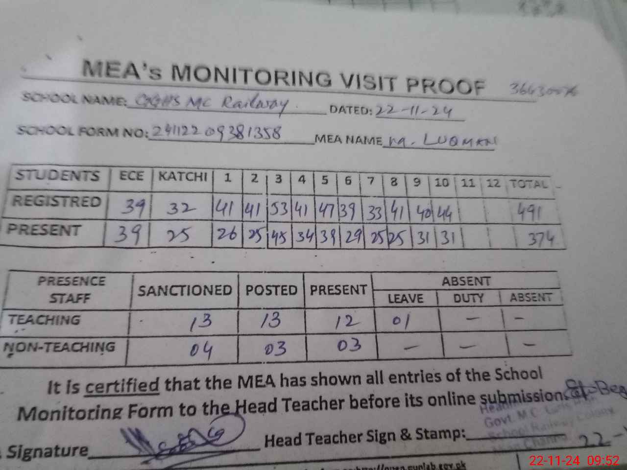 | EMIS Code: 36430076 | Name of School: GGHS MC RAILWAY COLONY, MIAN CHANNU | |||