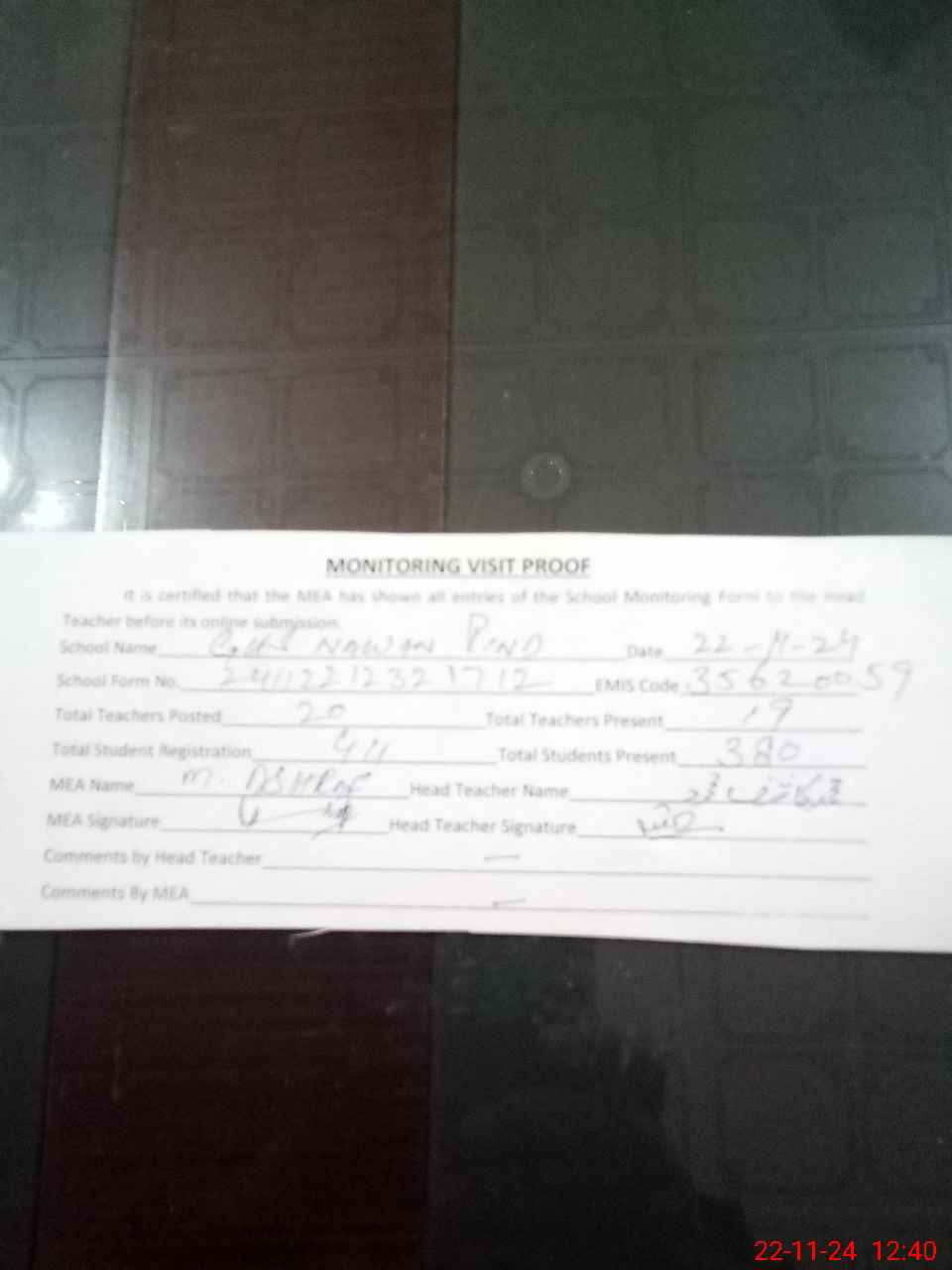 | Attendance Register | Head Teacher | MEA with School | Visit Proof |