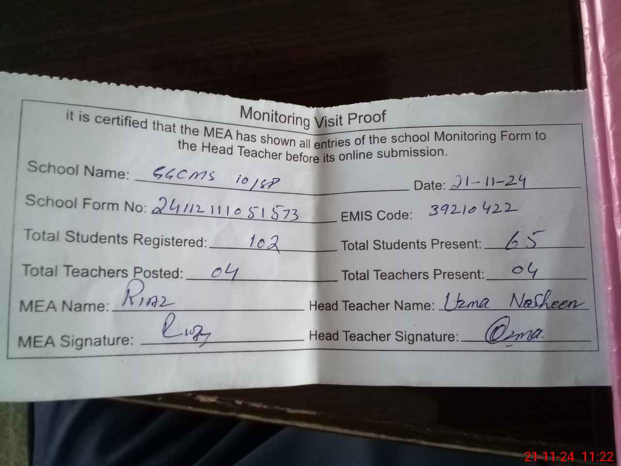 | Attendance Register | Head Teacher | MEA with School | Visit Proof |