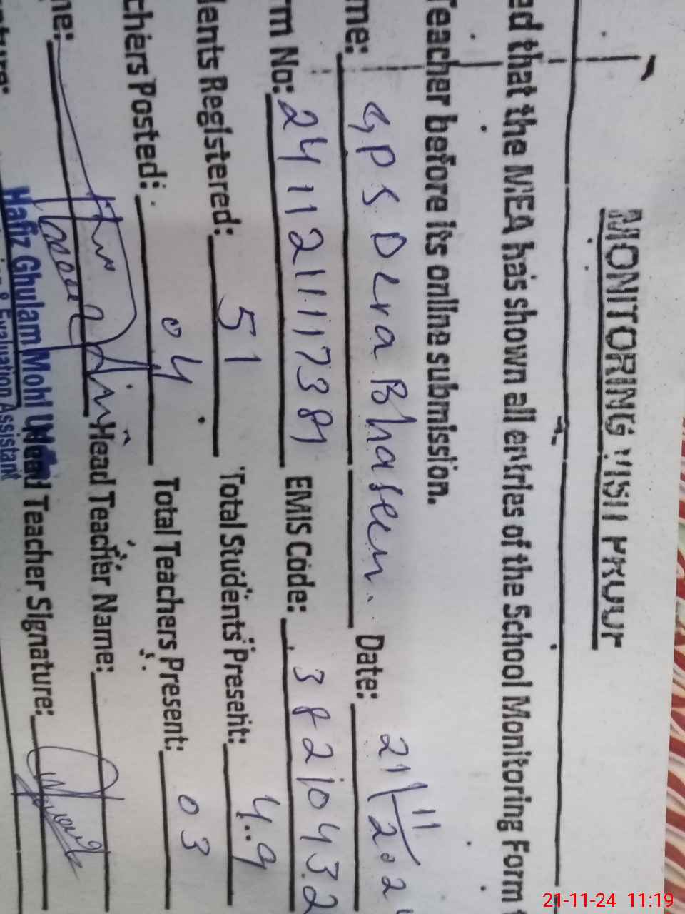 | EMIS Code: 38210432 | Name of School: GPS DERA BHASEEN | |||