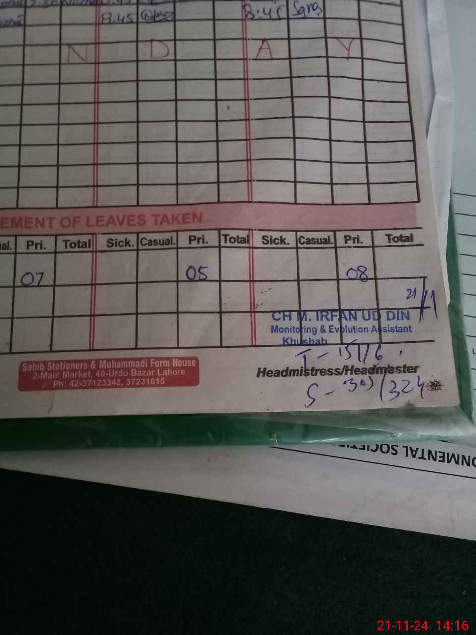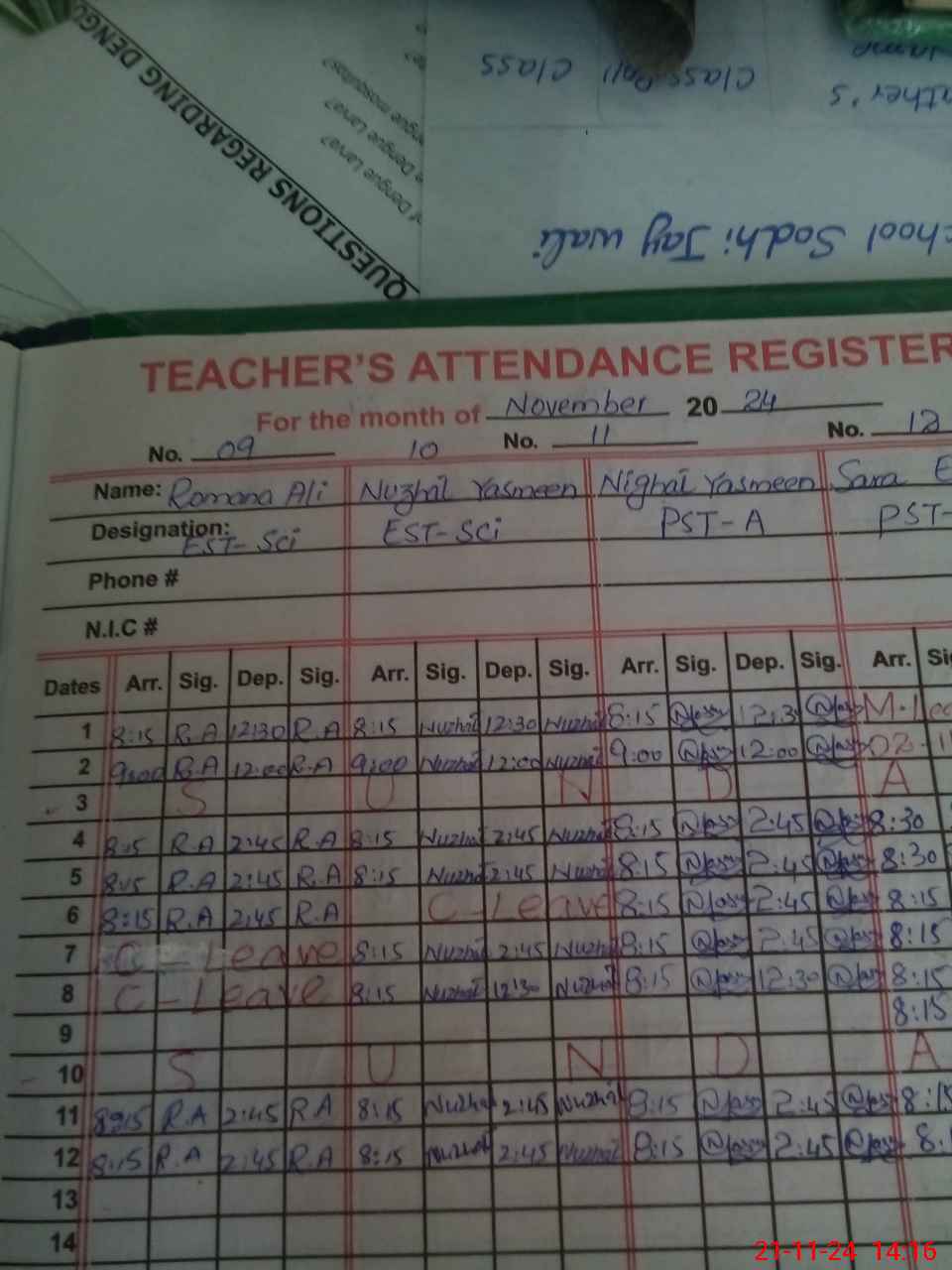 | CNIC | Full Name | Designation | R/C | Absence During Last Calender Month |