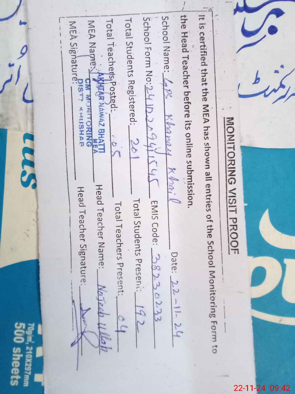 | Attendance Register | Head Teacher | MEA with School | Visit Proof |