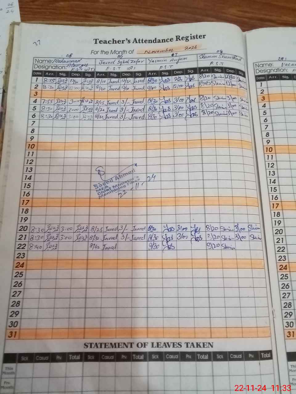 | CNIC | Full Name | Designation | R/C | Absence During Last Calender Month |