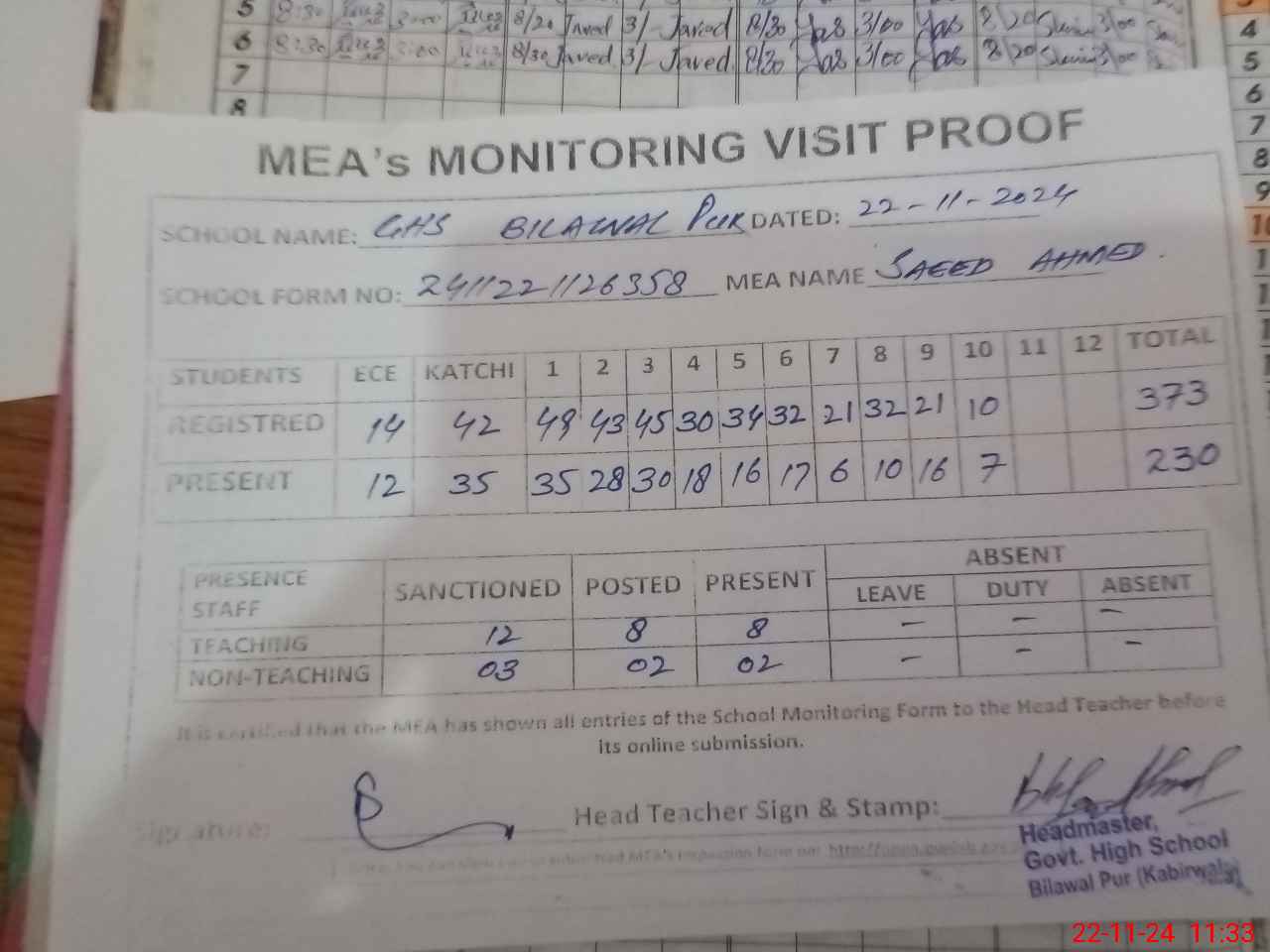 | Attendance Register | Head Teacher | MEA with School | Visit Proof |