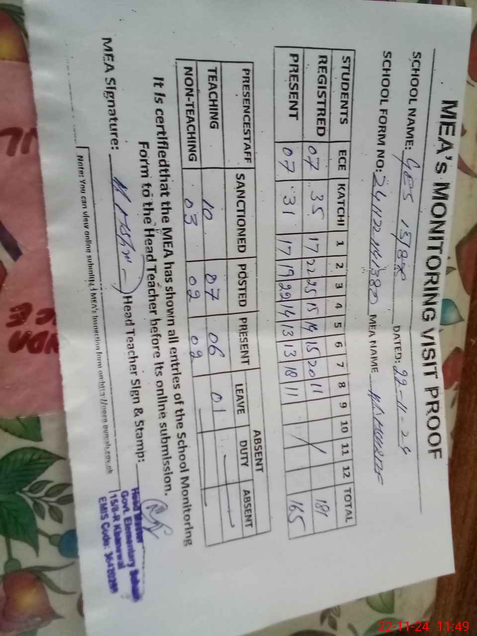 | Certified that this School was Inspected by the Undersigned MEA/DMO Today and the Information Stated Above is as Per Record. | |||||