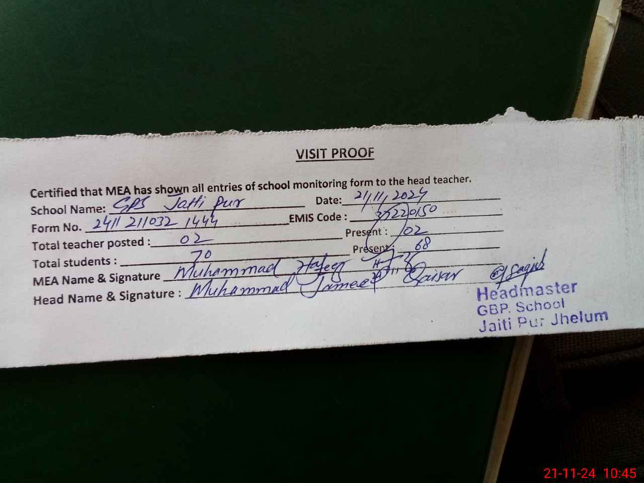 | Attendance Register | Head Teacher | MEA with School | Visit Proof |