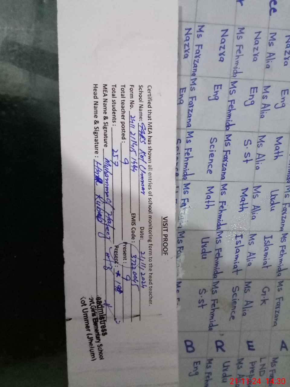 | Attendance Register | Head Teacher | MEA with School | Visit Proof |