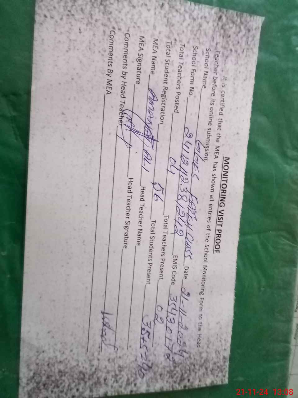 | Attendance Register | Head Teacher | MEA with School | Visit Proof |