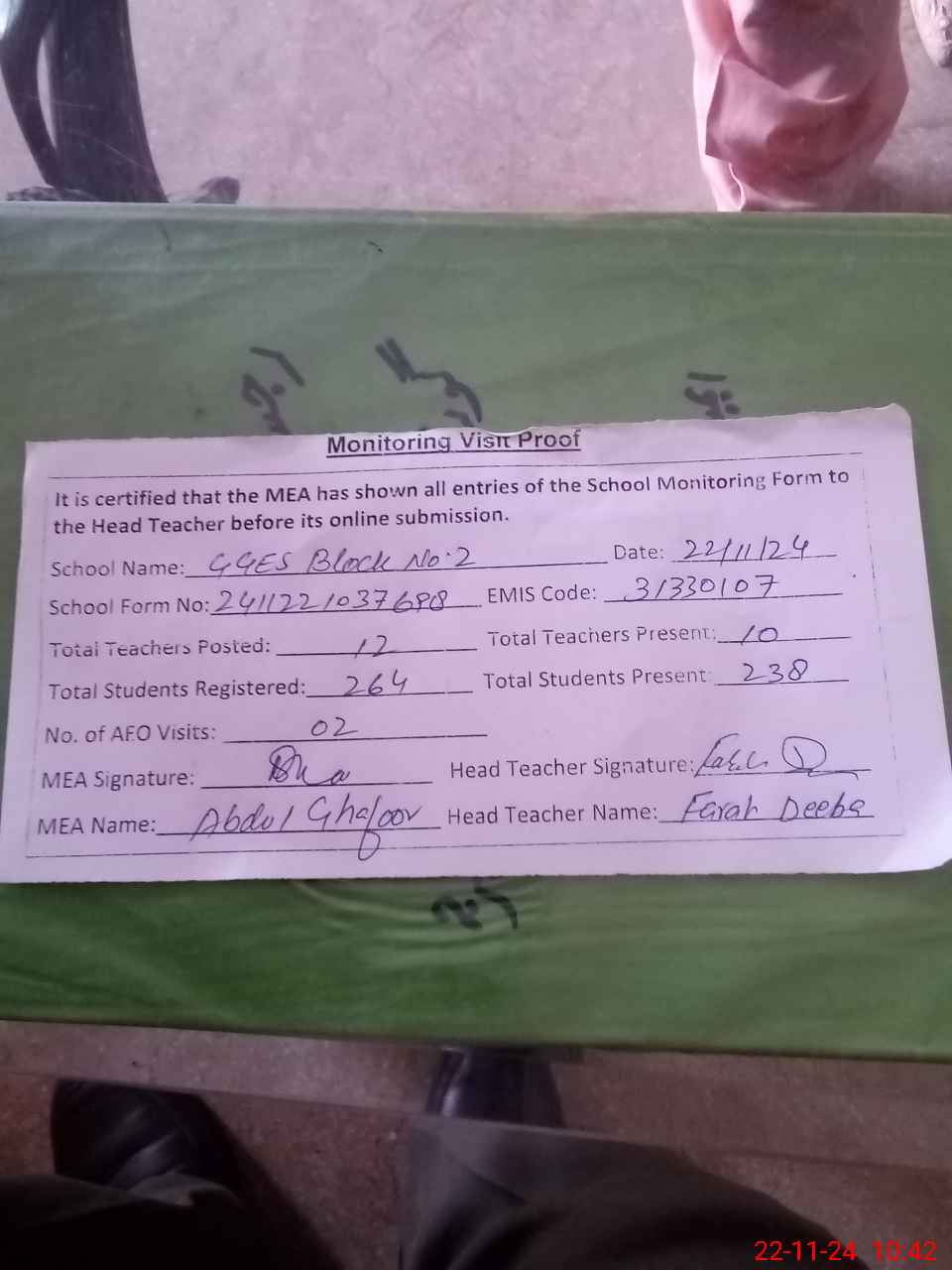 | Attendance Register | Head Teacher | MEA with School | Visit Proof |