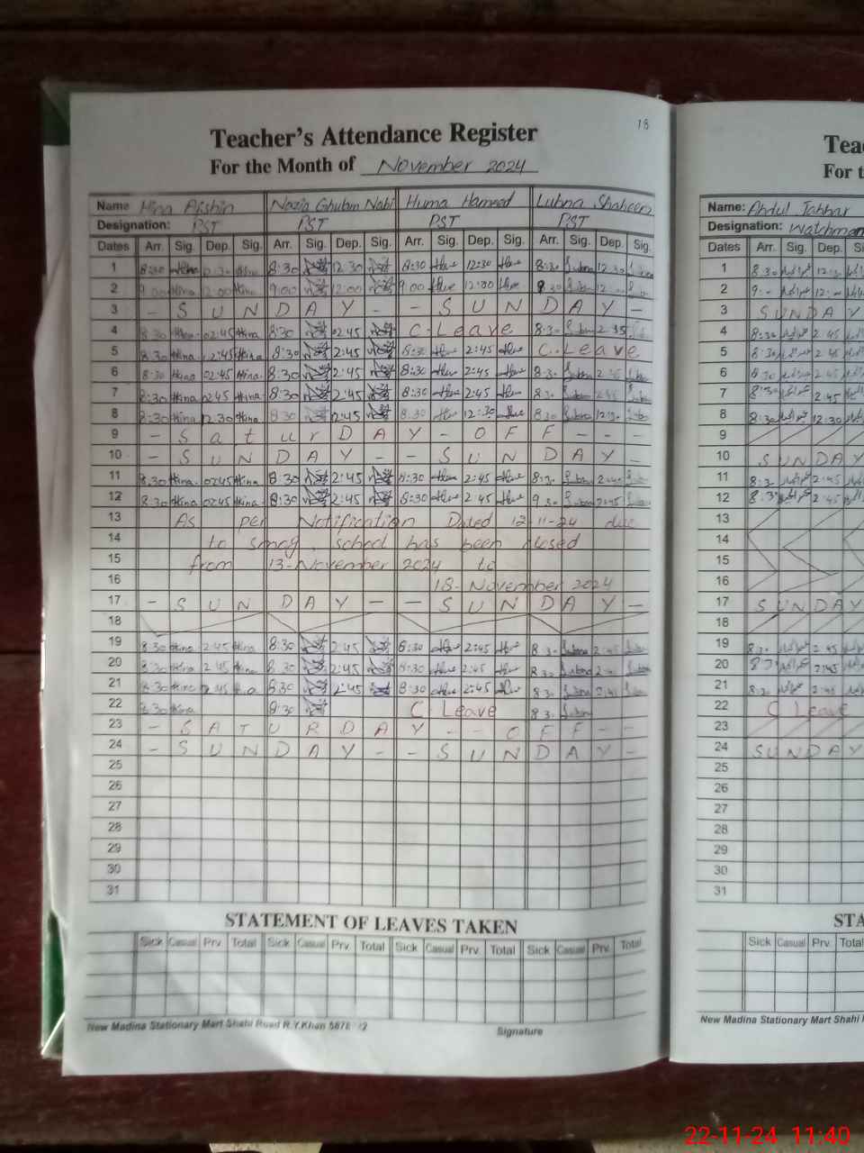 | CNIC | Full Name | Designation | R/C | Absence During Last Calender Month |