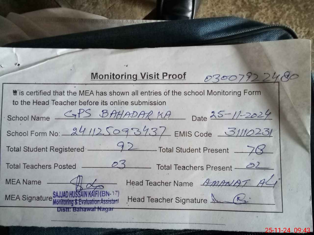| EMIS Code: 31110231 | Name of School: GPS BAHADUR KA SHARQI | |||