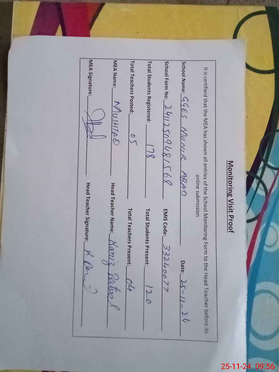 | Attendance Register | Head Teacher | MEA with School | Visit Proof |