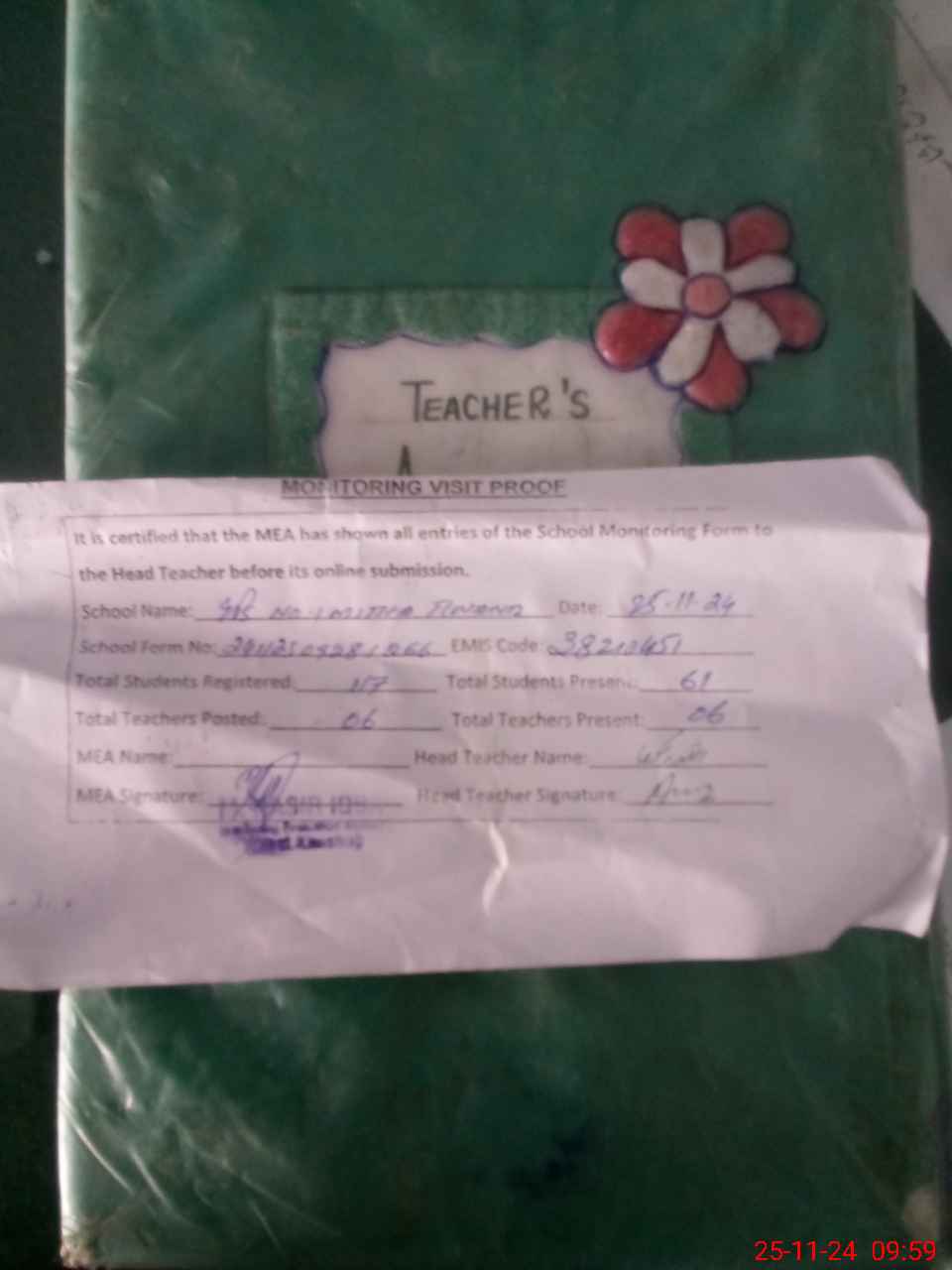 | Attendance Register | Head Teacher | MEA with School | Visit Proof |