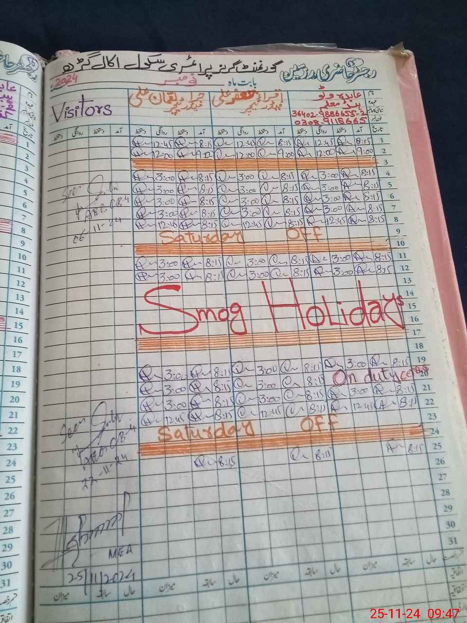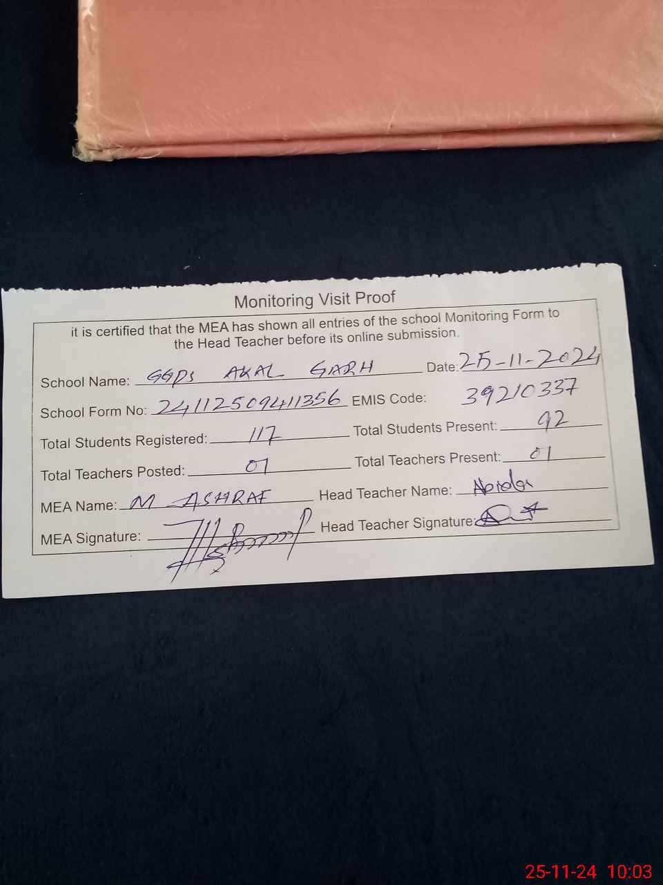 | Attendance Register | Head Teacher | MEA with School | Visit Proof |
