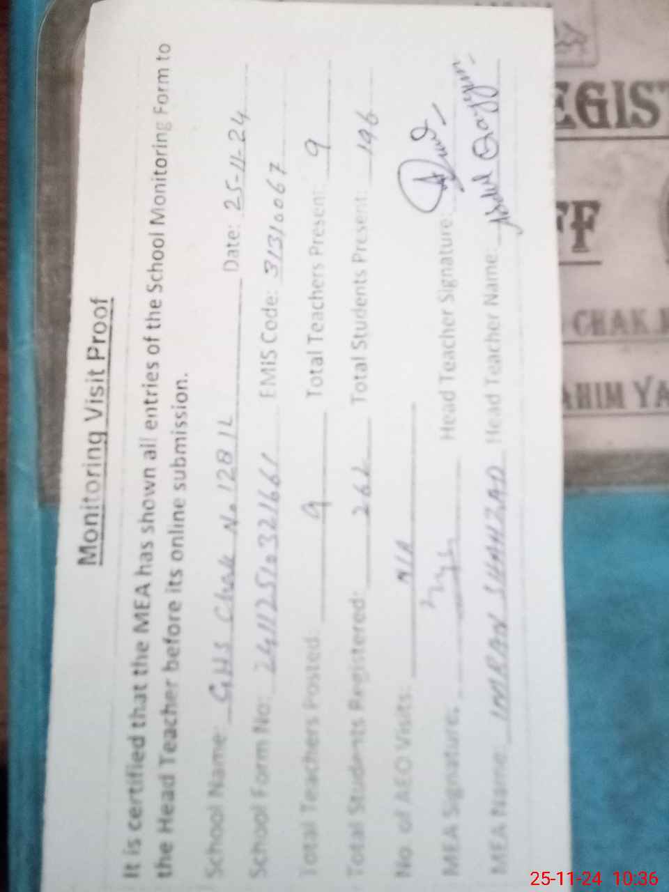| Attendance Register | Head Teacher | MEA with School | Visit Proof |