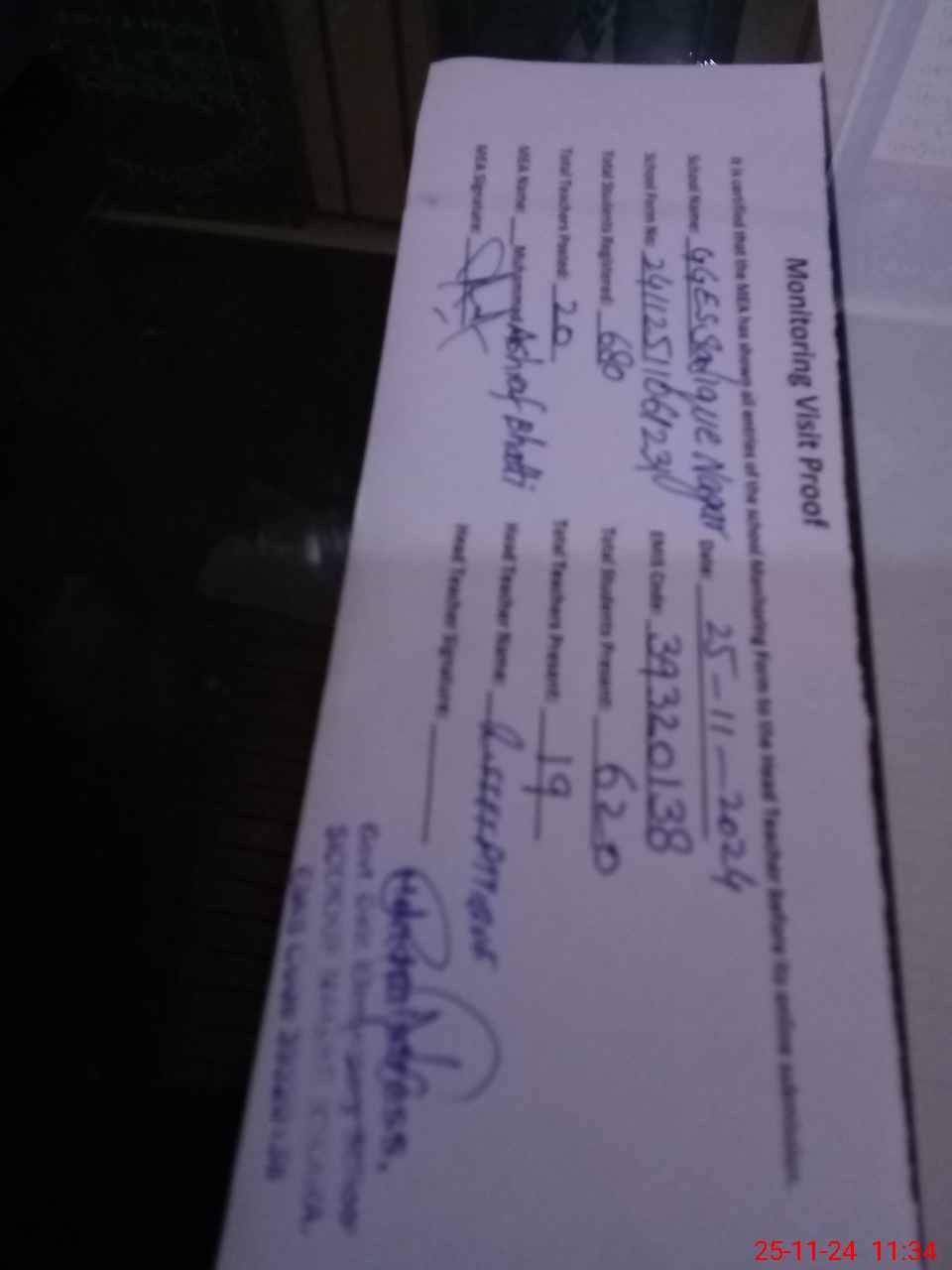 | Attendance Register | Head Teacher | MEA with School | Visit Proof |
