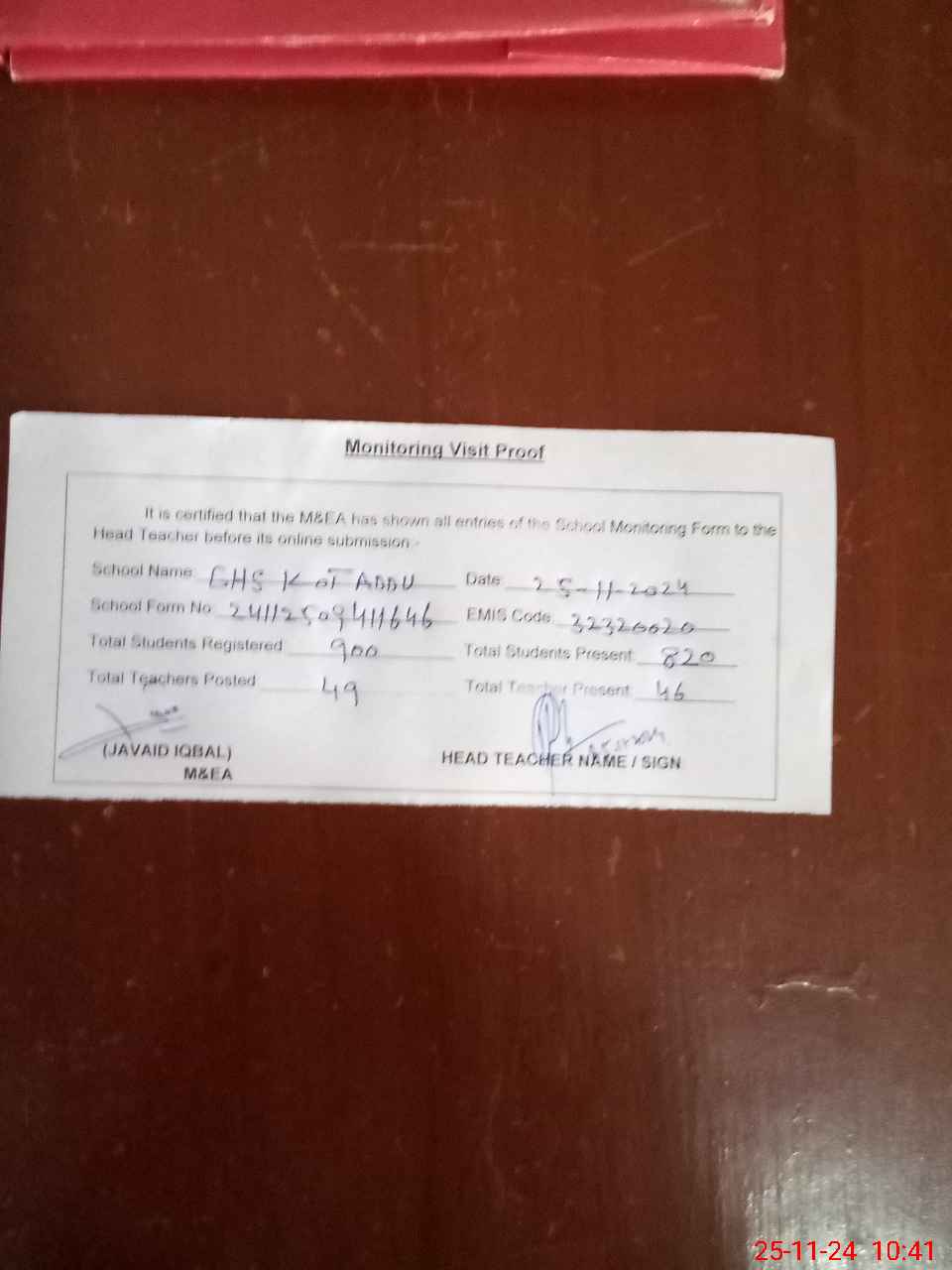 | Attendance Register | Head Teacher | MEA with School | Visit Proof |