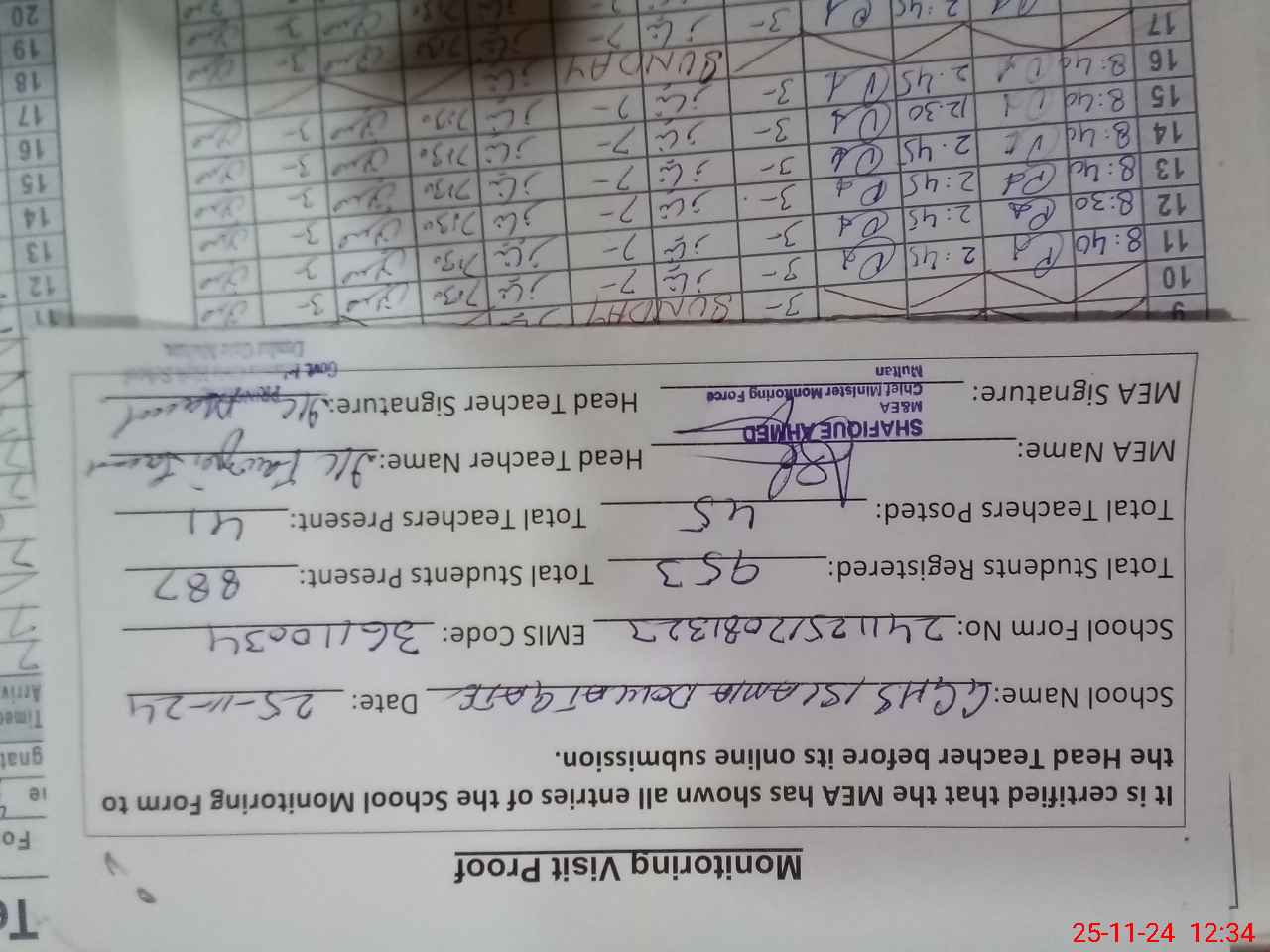 | Monitoring Date: 25-11-2024 | Start Time: 25-11-2024 12:08 PM | End Time: 25-11-2024 12:35 PM | Name of MEA: SH**** AH**** | |