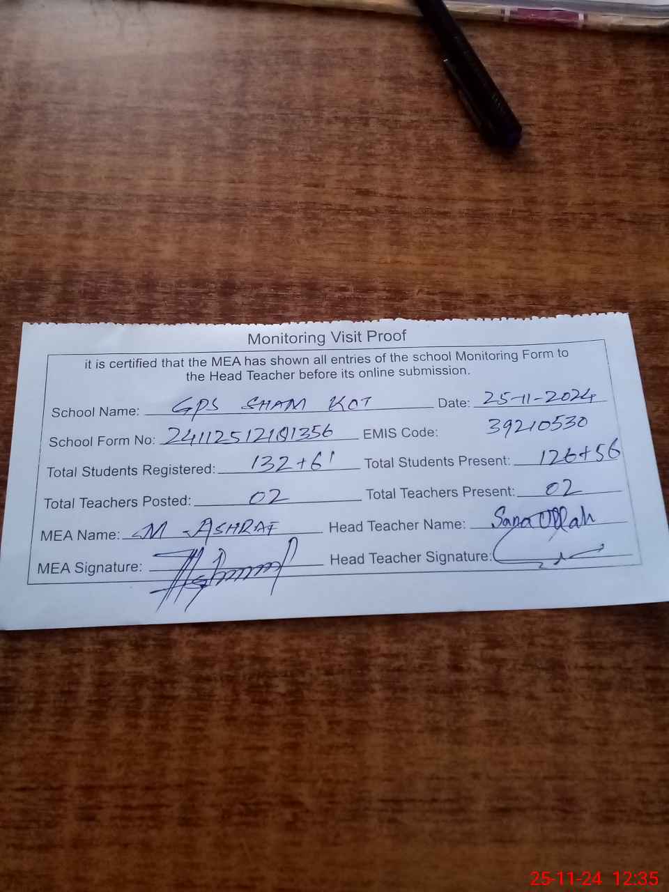 | Attendance Register | Head Teacher | MEA with School | Visit Proof |