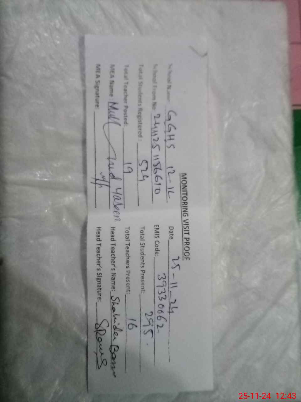 | Attendance Register | Head Teacher | MEA with School | Visit Proof |