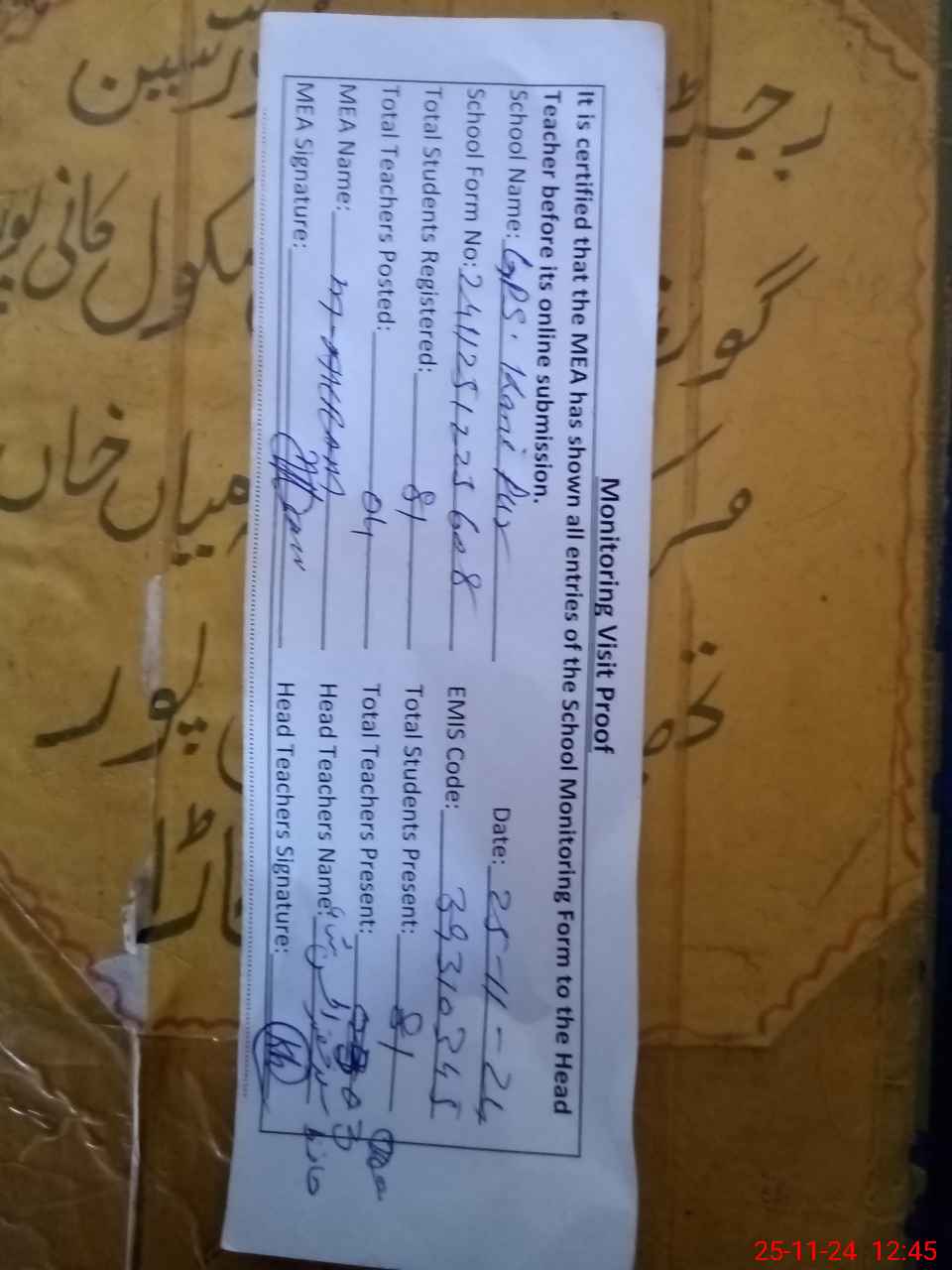 | Attendance Register | Head Teacher | MEA with School | Visit Proof |