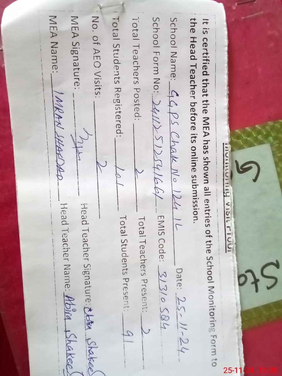 | Attendance Register | Head Teacher | MEA with School | Visit Proof |