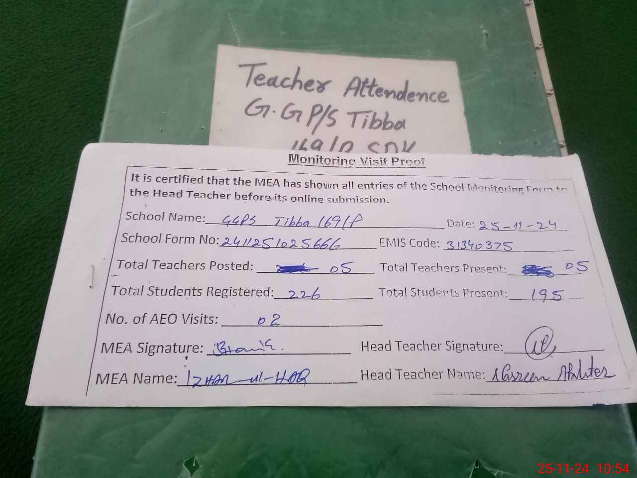 | Attendance Register | Head Teacher | MEA with School | Visit Proof |