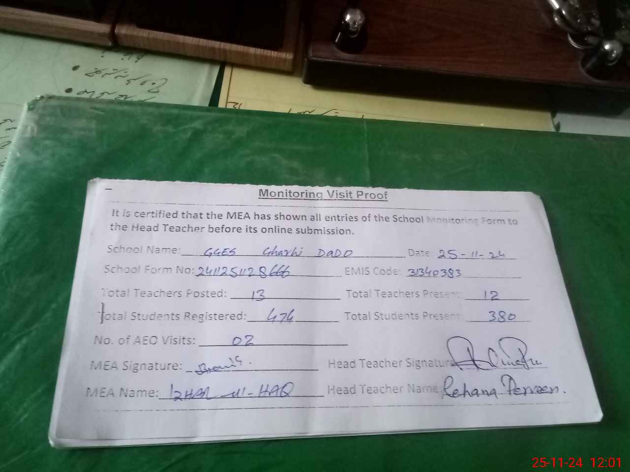 | Attendance Register | Head Teacher | MEA with School | Visit Proof |