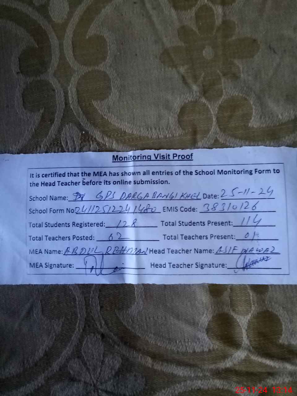 | Attendance Register | Head Teacher | MEA with School | Visit Proof |