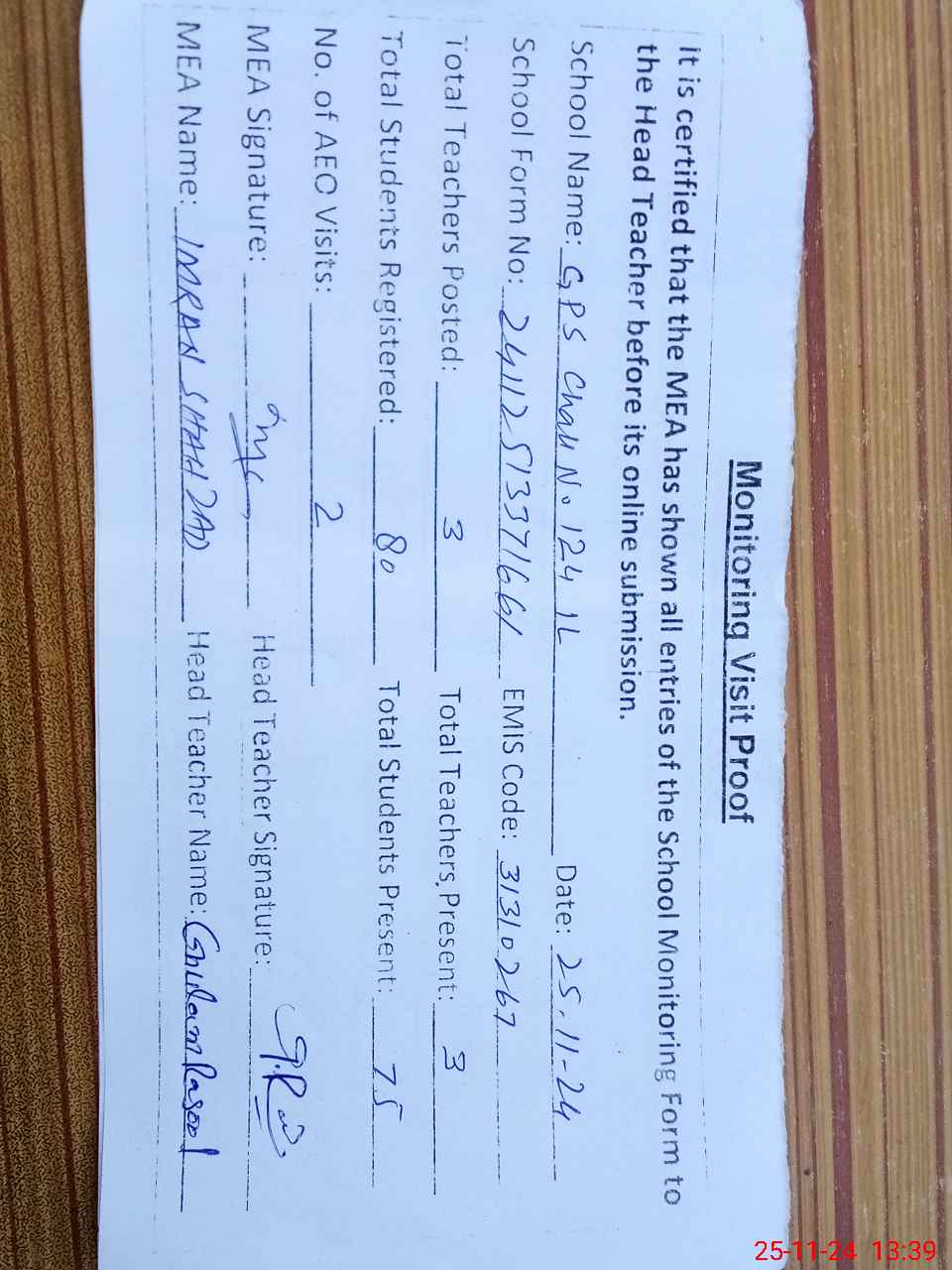 | Attendance Register | Head Teacher | MEA with School | Visit Proof |