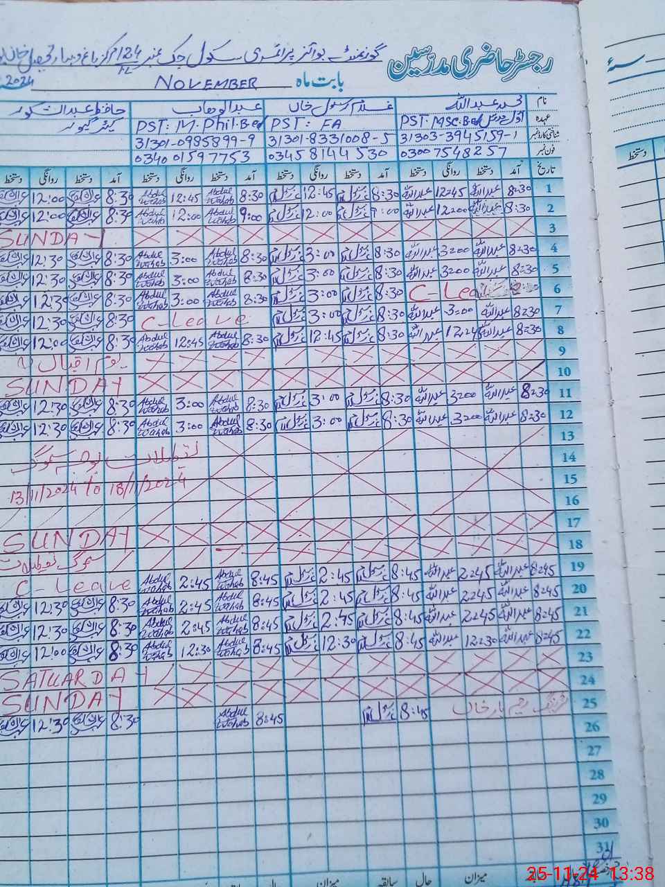 | CNIC | Full Name | Designation | R/C | Absence During Last Calender Month |