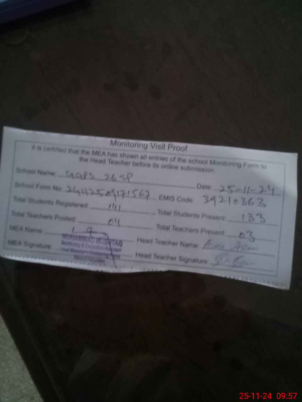 | Attendance Register | Head Teacher | MEA with School | Visit Proof |