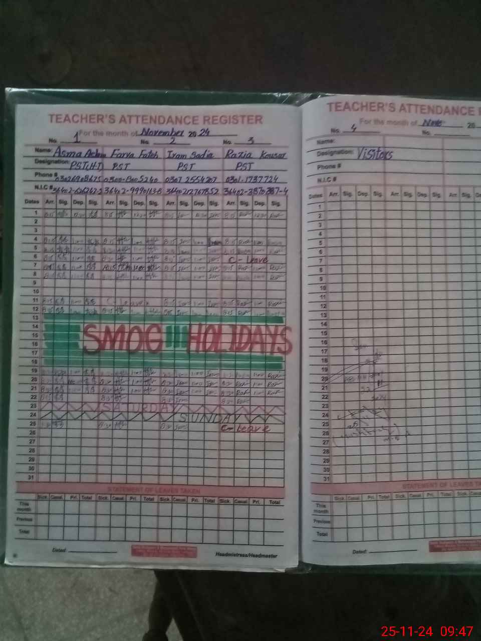 | CNIC | Full Name | Designation | R/C | Absence During Last Calender Month |