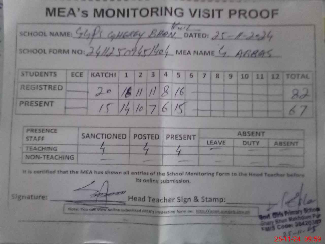 | Attendance Register | Head Teacher | MEA with School | Visit Proof |