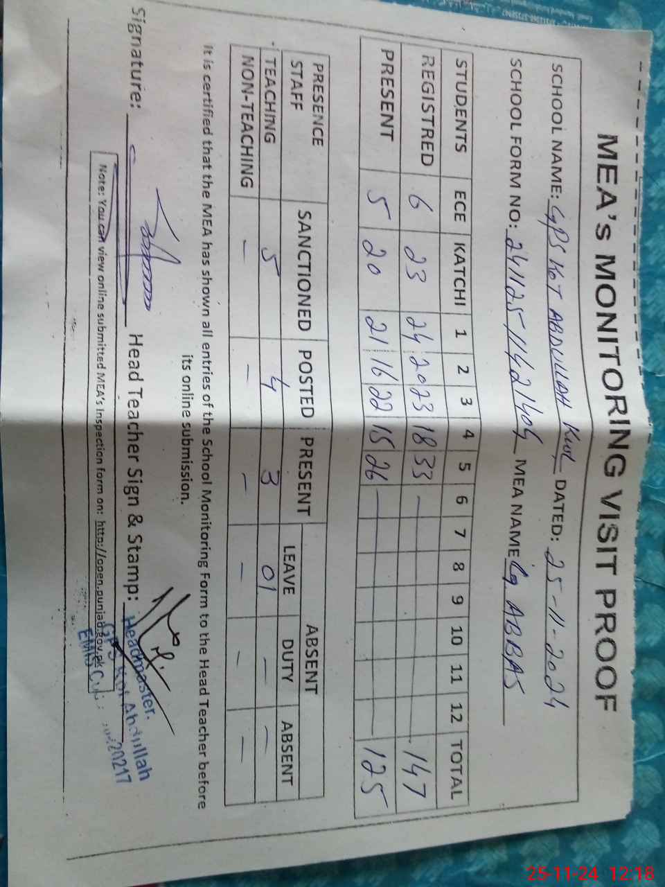| EMIS Code: 36420217 | Name of School: GPS KOT ABDULLAH, P/O MAKHDOOM PUR, KHANEWAL | |||
