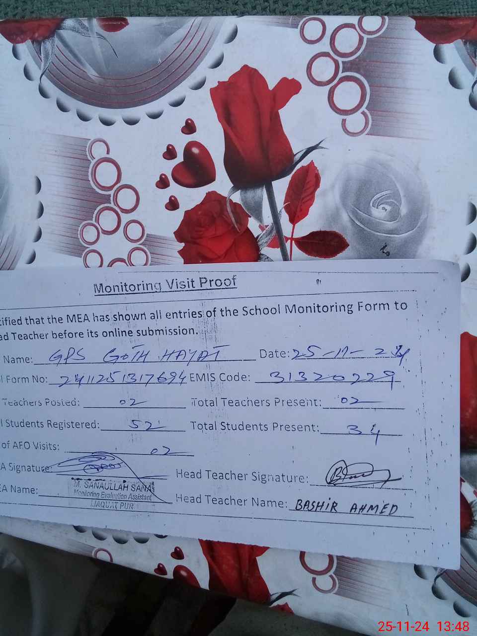 | Attendance Register | Head Teacher | MEA with School | Visit Proof |