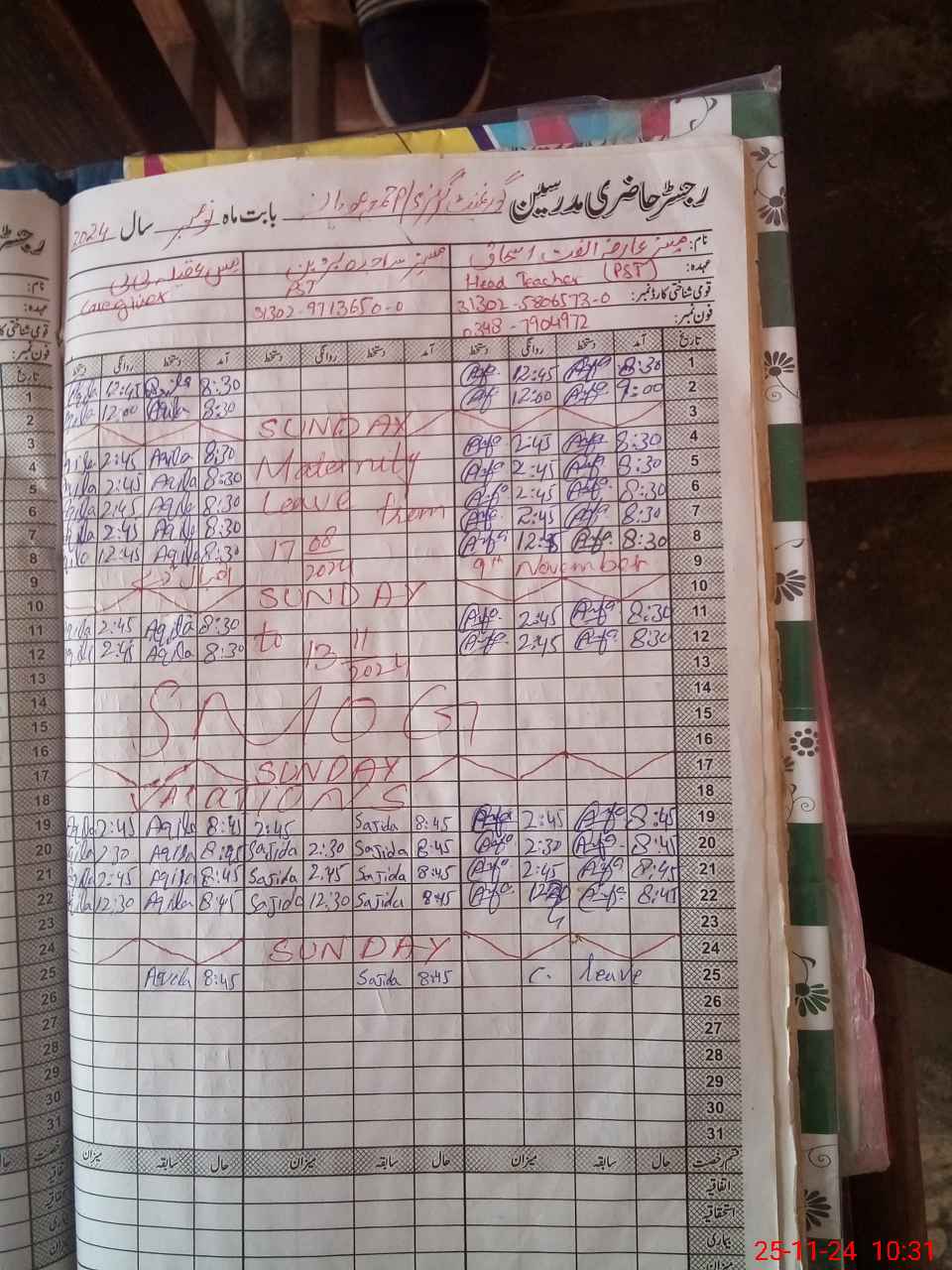 | Leave | Duty | Absent | Maternity | Medical | Ex- Pak |