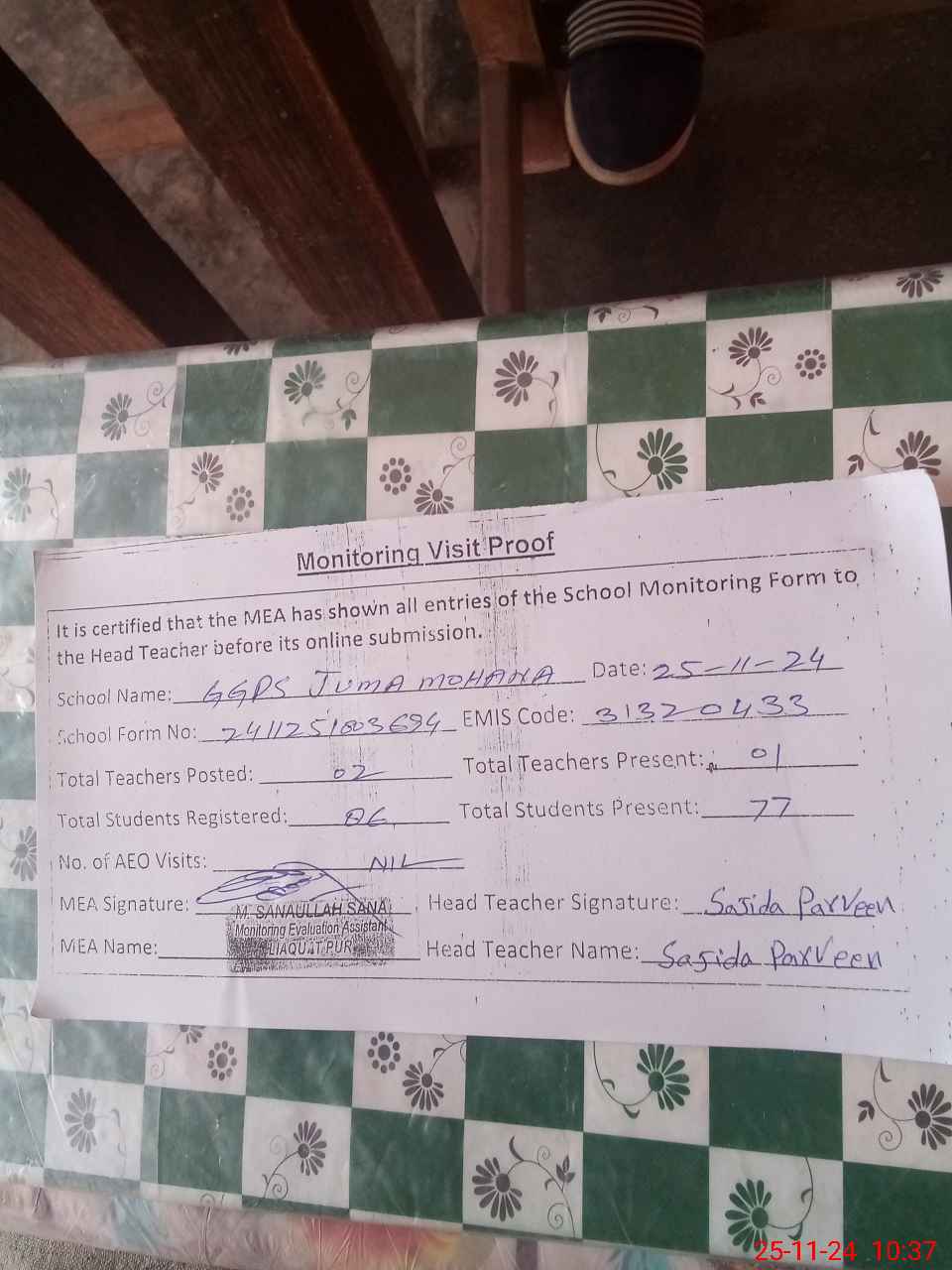 | Monitoring Date: 25-11-2024 | Start Time: 25-11-2024 10:03 AM | End Time: 25-11-2024 10:37 AM | Name of MEA: Mu**** Sa**** Ul**** Sa**** | |
