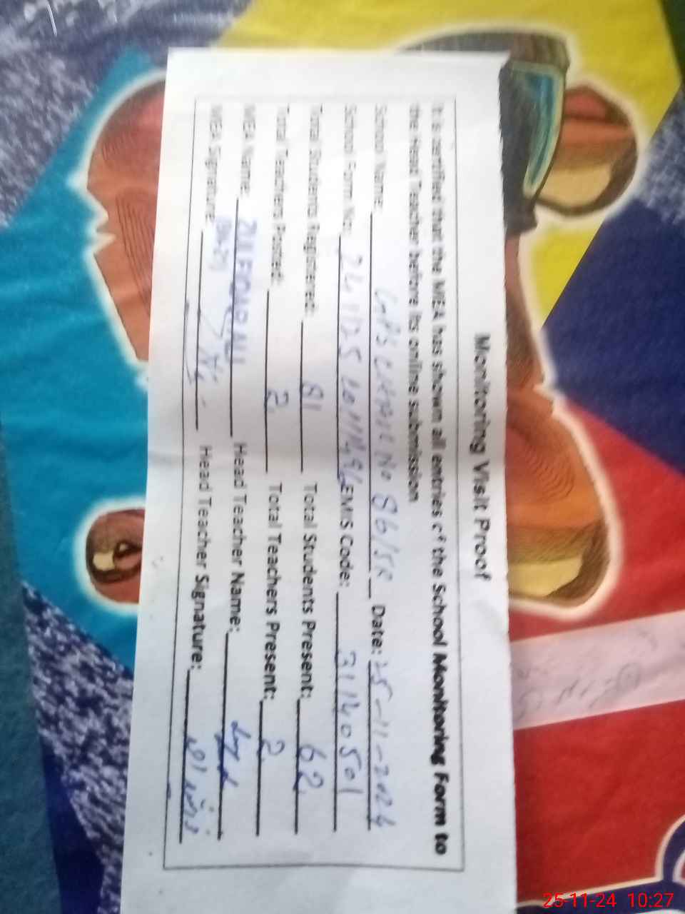 | Attendance Register | Head Teacher | MEA with School | Visit Proof |