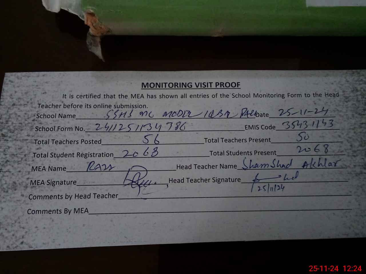 | Attendance Register | Head Teacher | MEA with School | Visit Proof |