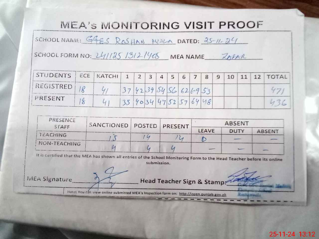 | Attendance Register | Head Teacher | MEA with School | Visit Proof |