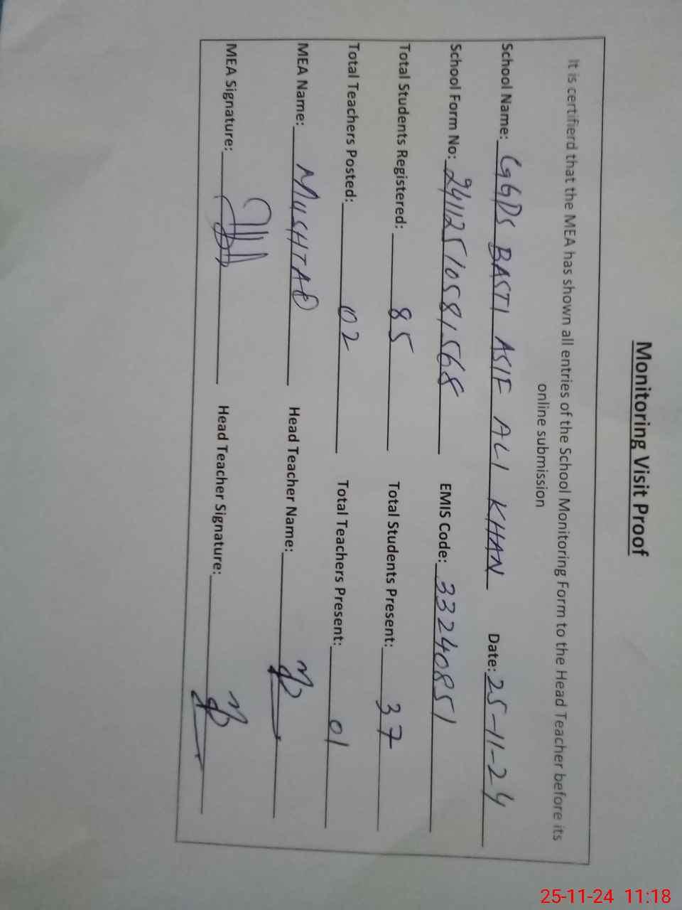 | Attendance Register | Head Teacher | MEA with School | Visit Proof |