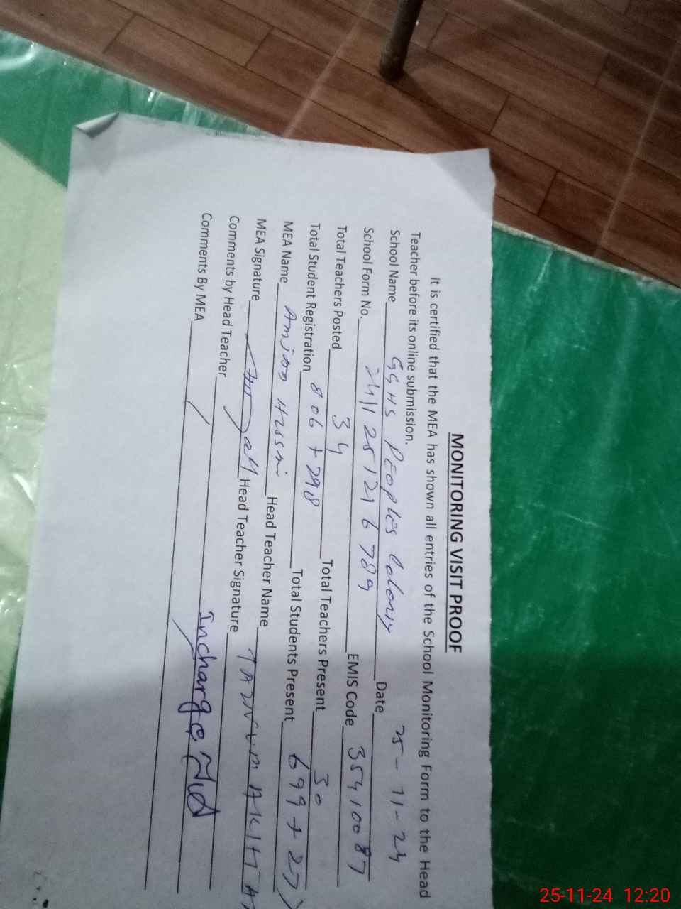 | Attendance Register | Head Teacher | MEA with School | Visit Proof |