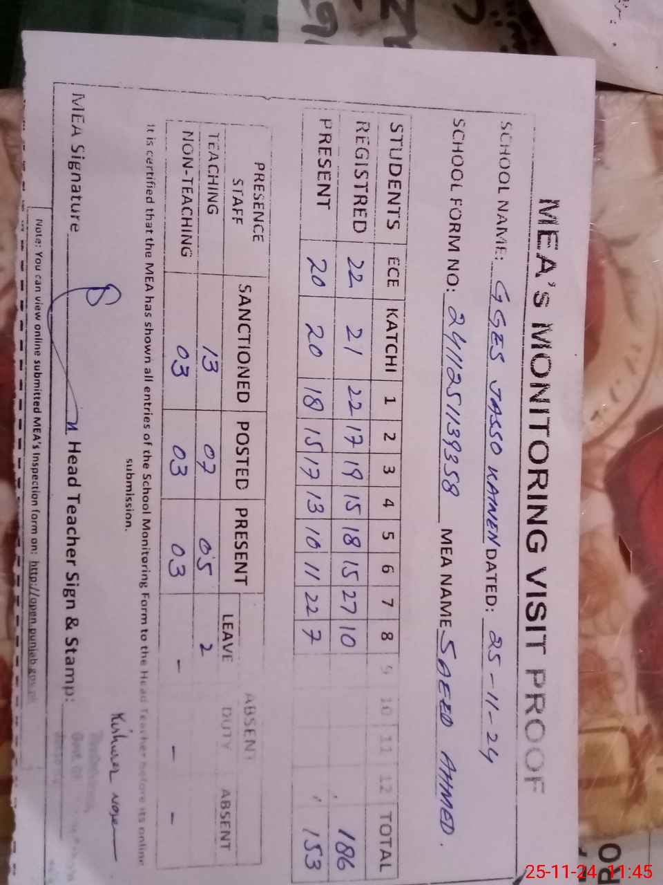 | Attendance Register | Head Teacher | MEA with School | Visit Proof |